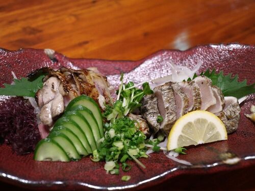 2・目の晩ごはんはホテル近くのお店でと思ったら 臨時休業 天文館公園の真ん前にある「瑛炭」という居酒屋さんへ 現地の友人がいると助かりますね・・・ありがとうございます! eitan.owst.jp お通しがんこ鶏の炙り刺し とり皮ポン酢 おまかせ串盛り10本 薩…