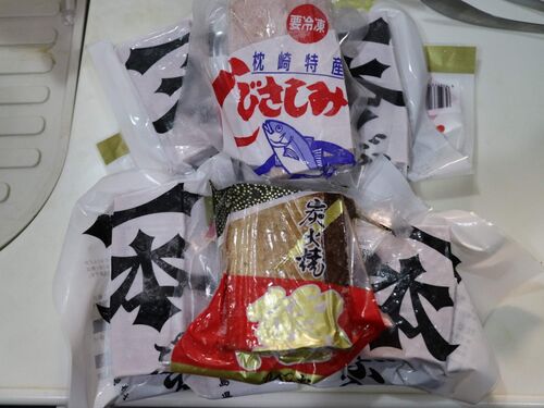 今回のおみやげ〜 一番最初に青島で買った焼酎! オーク樽で寝かせた麦焼酎 42度 最後に見つけたMUGEN白波トロピカルウェーブ どんな味なんでしょうかね? 勢いで買った、ボロニアソーセージ 山形屋で買った 明石屋のかるかん他 酢味噌はなにか使うでしょう…